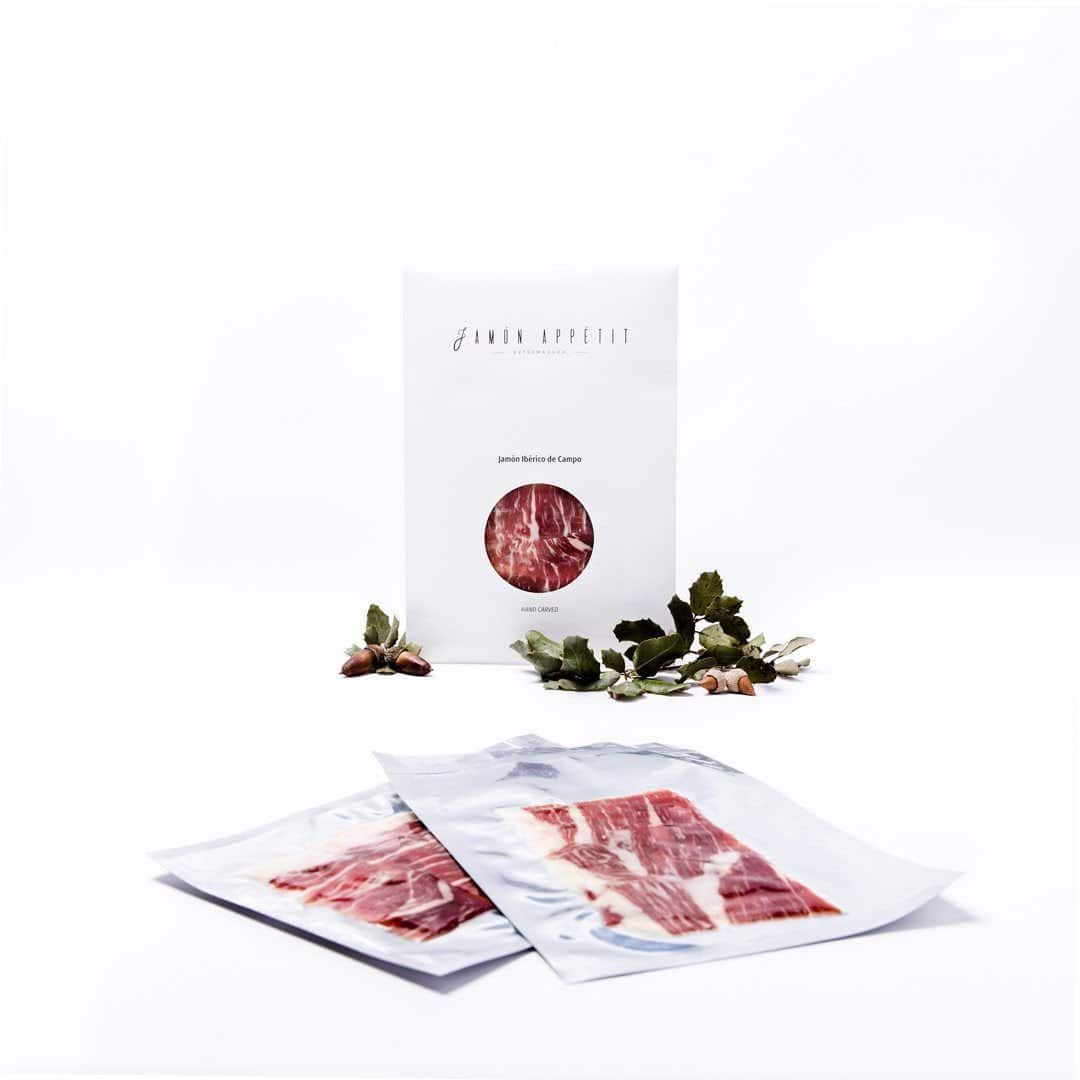 Jambon de Porc Ibérique de Campo (Pata Negra) elevé en semi-liberté dans les dehesas naturelles d` Estrémadure et ils ont une alimentation à base aliment naturel, fourrages verts et quelques bellotas (Glands de chênes verts) en période de montanera.